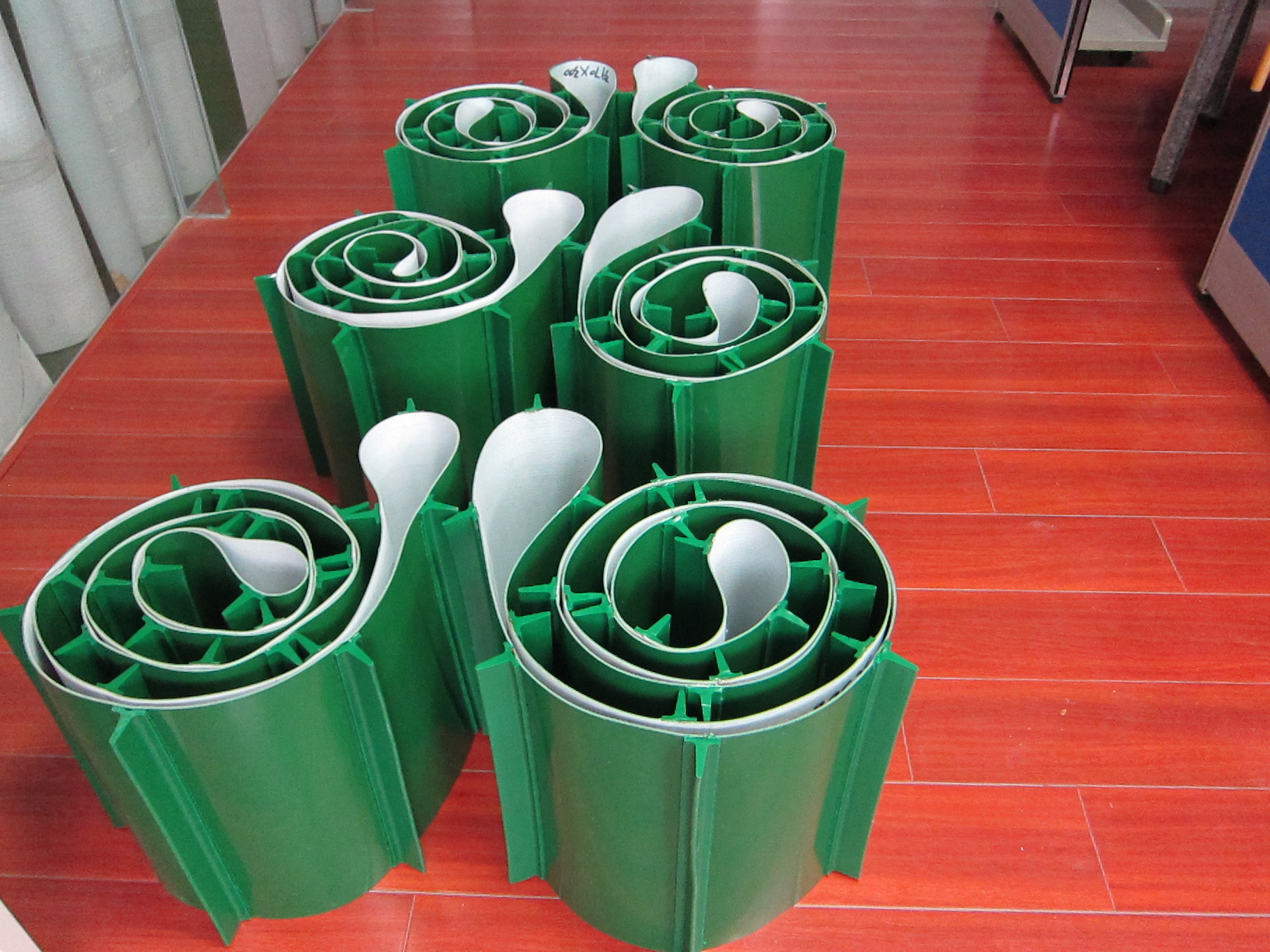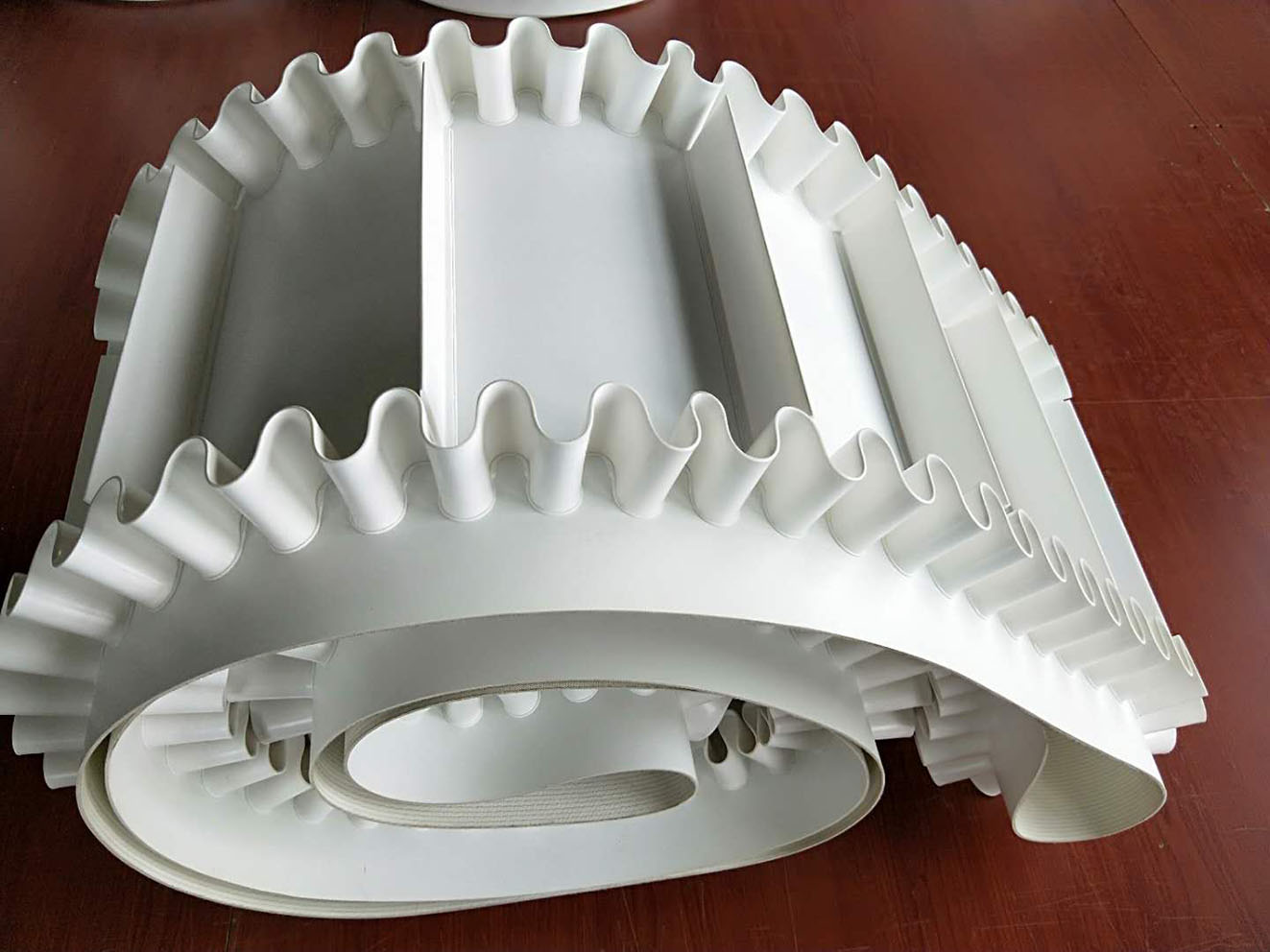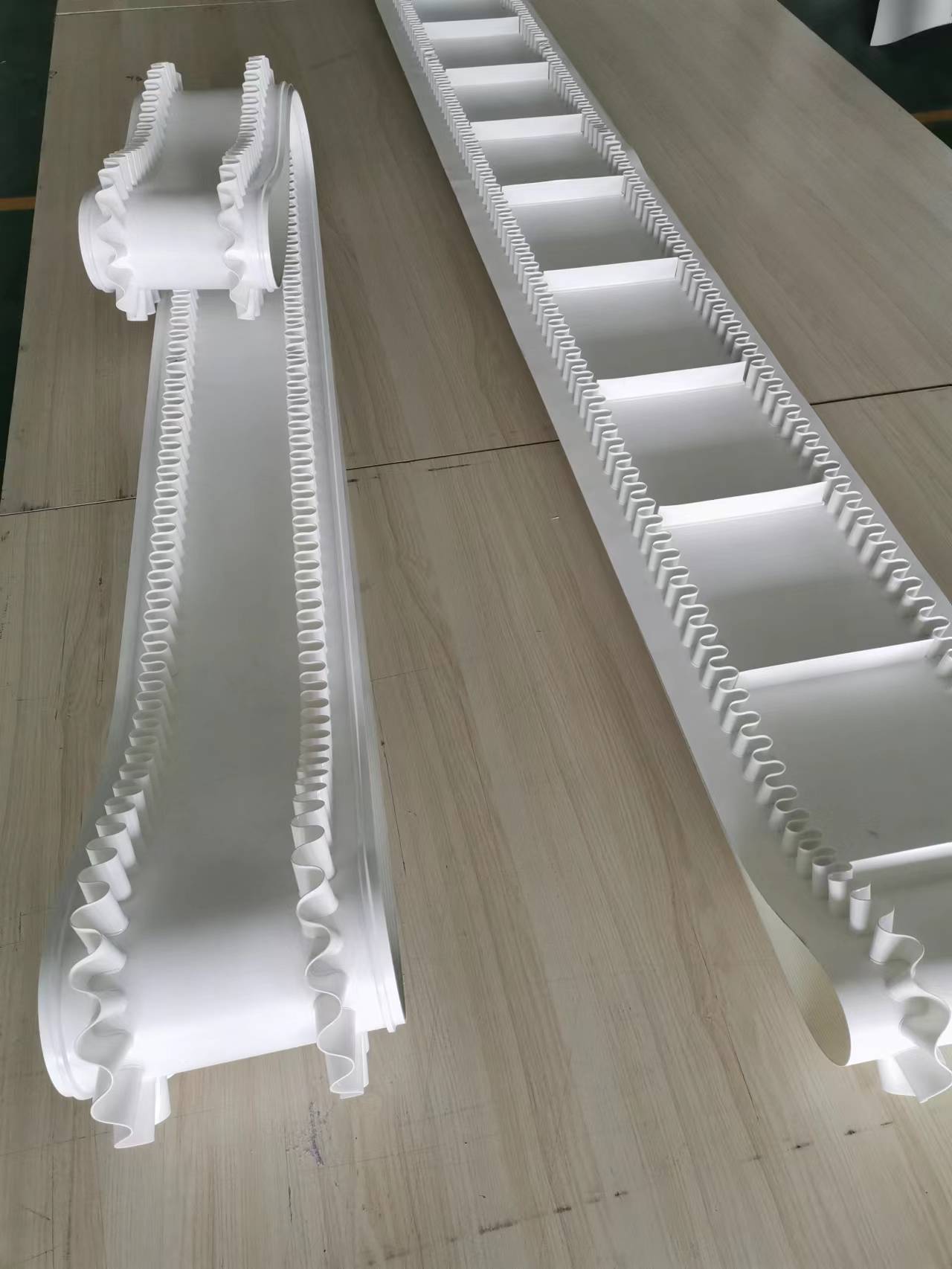 輸送帶(裙邊擋板帶),擋邊起防止物料測滑撒落的作用。為便于轉彎,裙邊設計成波紋狀;橫隔板的作用是承托物料,為了實現(xiàn)大傾角輸送,采用T型TC型。檔邊和橫隔板是用二次硫化的方法與基帶連接的,具有很高的連接強度。用于輸送易散落的粉狀、粒狀、小塊狀、糊狀及液態(tài)狀物料。