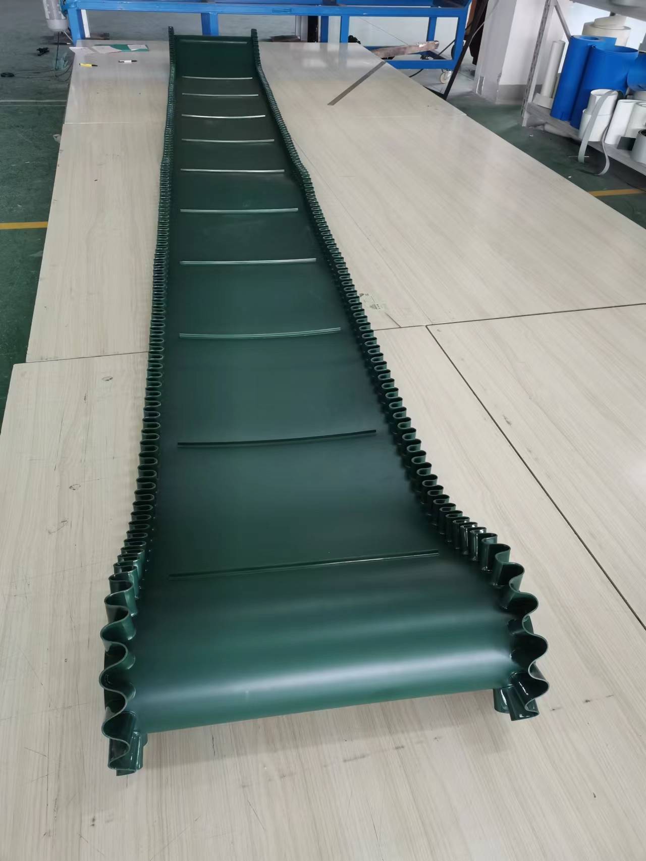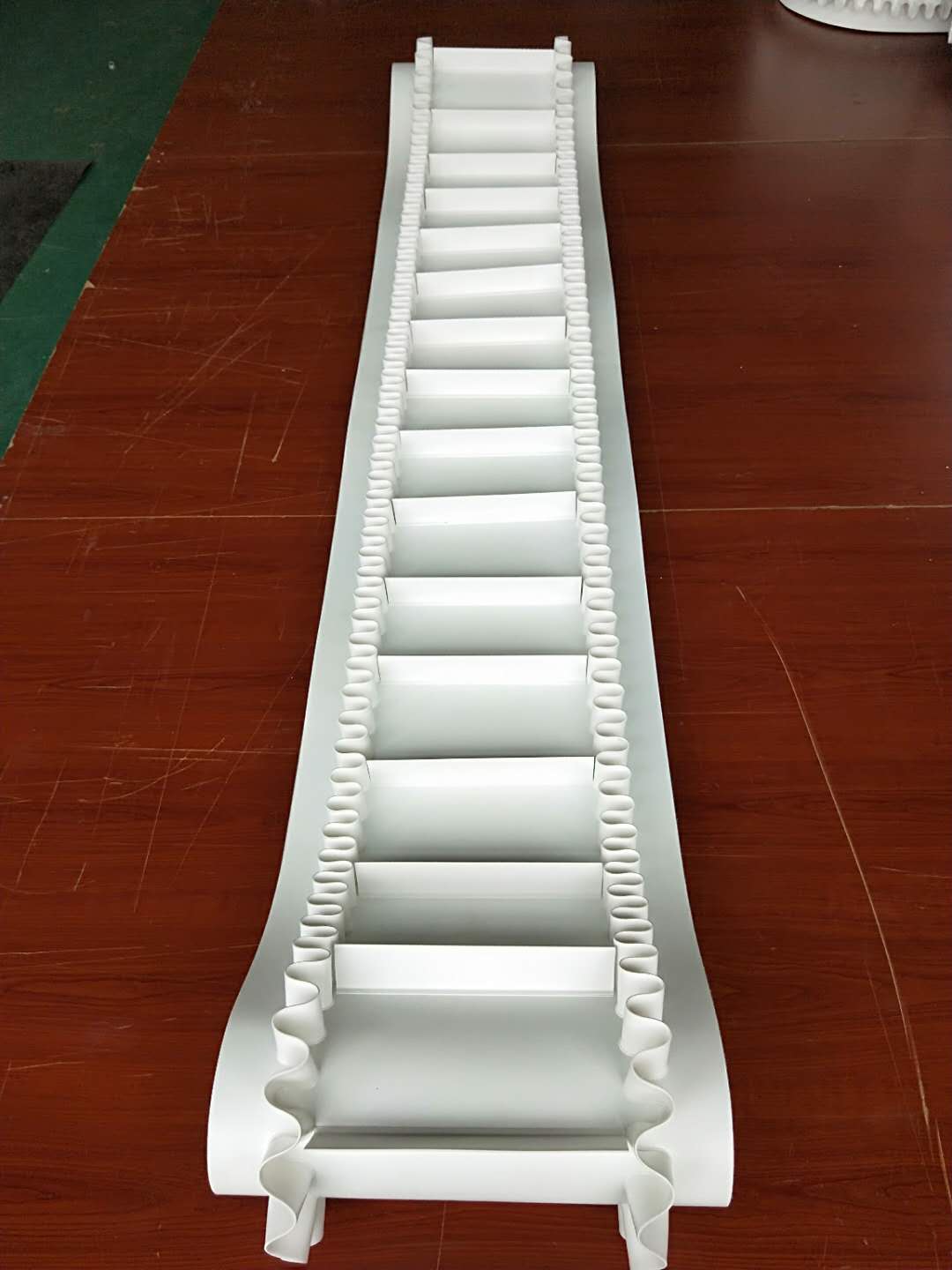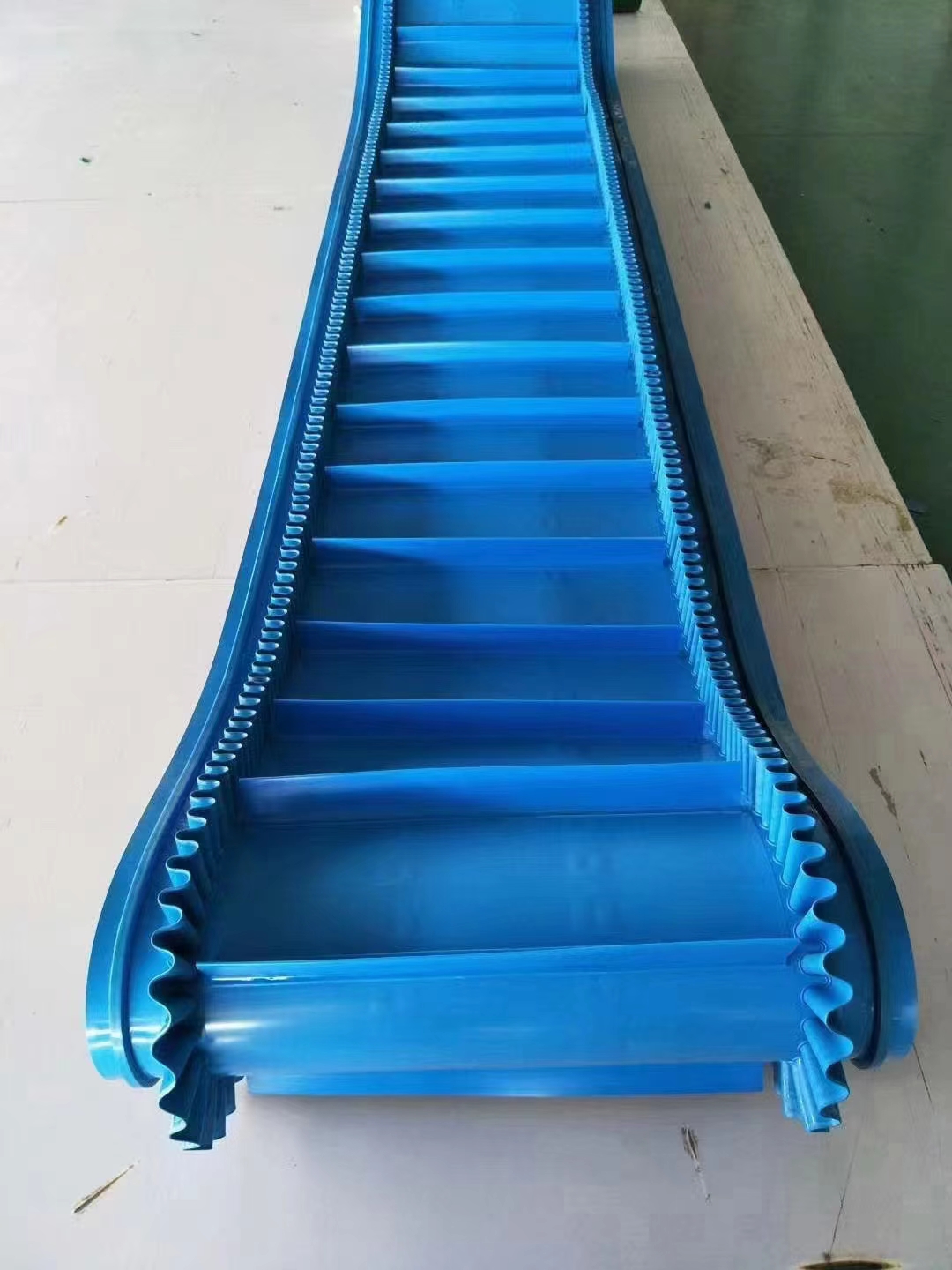 輸送帶(裙邊擋板帶),擋邊起防止物料測滑撒落的作用。為便于轉彎,裙邊設計成波紋狀;橫隔板的作用是承托物料,為了實現(xiàn)大傾角輸送,采用T型TC型。檔邊和橫隔板是用二次硫化的方法與基帶連接的,具有很高的連接強度。用于輸送易散落的粉狀、粒狀、小塊狀、糊狀及液態(tài)狀物料。