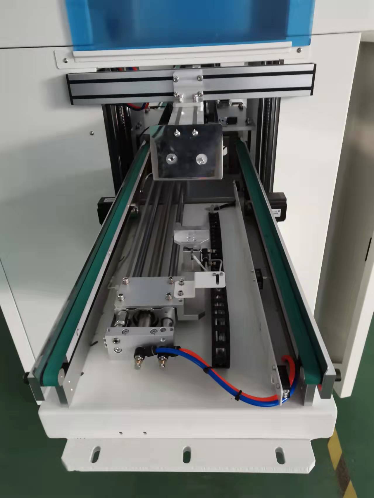 1、智能裝備生產線有循環(huán)式傳輸系統(tǒng)和智能裝配系統(tǒng),循環(huán)式傳輸系統(tǒng)包括一般傳輸機構、入口傳輸機構和出口傳輸機構,智能裝配系統(tǒng)設置干入口傳輸機構與出口傳輸機構之間,智能裝配系統(tǒng)包括主控電箱、動力傳動機構、凸輪機械手、檢測機構、智能定位傳輸機構和交換平臺。動力傳動機構包括主軸傳動組件、第一凸輪傳動組件、其次凸輪傳動組件和第三凸輪傳動組件;接受凸輪傳動的結構能夠實現同步動作,且整體傳動部件較少,凸輪傳動更穩(wěn)定,能夠保證同步傳動的精度,從而提高工件加工或者裝配的效率,凸輪傳動結構占用空間較少,能夠實現整機的同步動作,可實現多個不同的工件進行同步加工或者裝配。