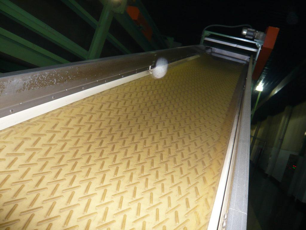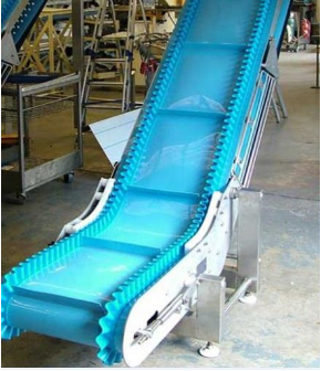 PU白色食品輸送帶(裙邊擋板帶),擋邊起防止物料測滑撒落的作用。為便于轉彎,裙邊設計成波紋狀;橫隔板的作用是承托物料,為了實現大傾角輸送,采用T型TC型。檔邊和橫隔板是用二次硫化的方法與基帶連接的,具有很高的連接強度。用于輸送易散落的粉狀、粒狀、小塊狀、糊狀及液態(tài)狀物料。